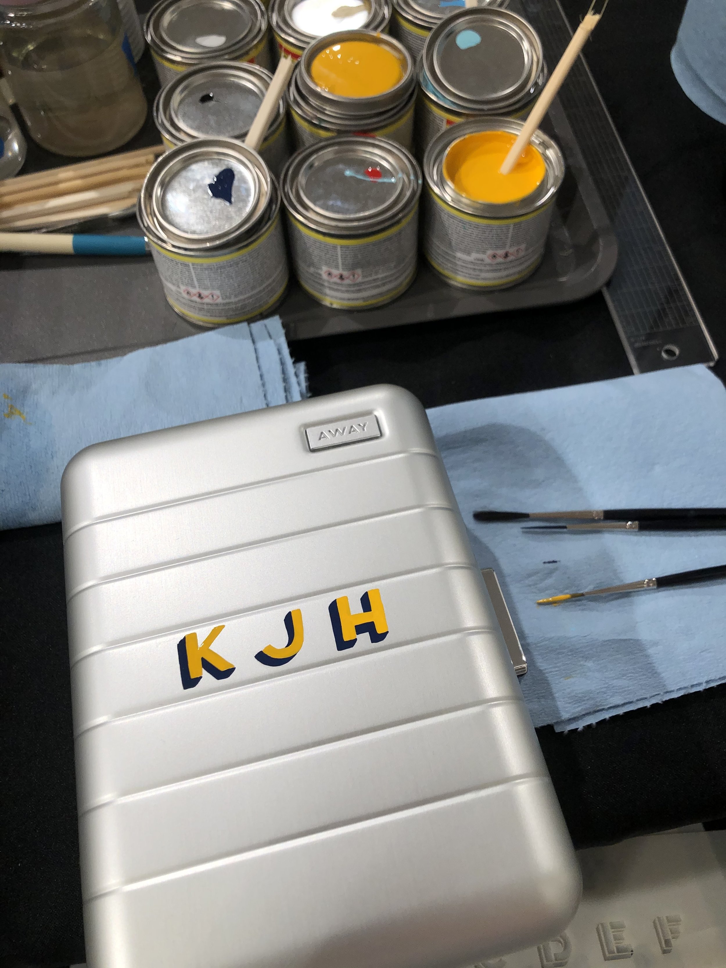 For a few years before 2020, I had the pleasure of painting monograms at Away in San Francisco. They had weekend events at their Hayes Valley store where customers could purchase luggage or bring in previously purchased pieces and have them monogrammed while they waited. I painted their iconic block letter/shadow style, as well as a few other lettering styles and lots of color options.