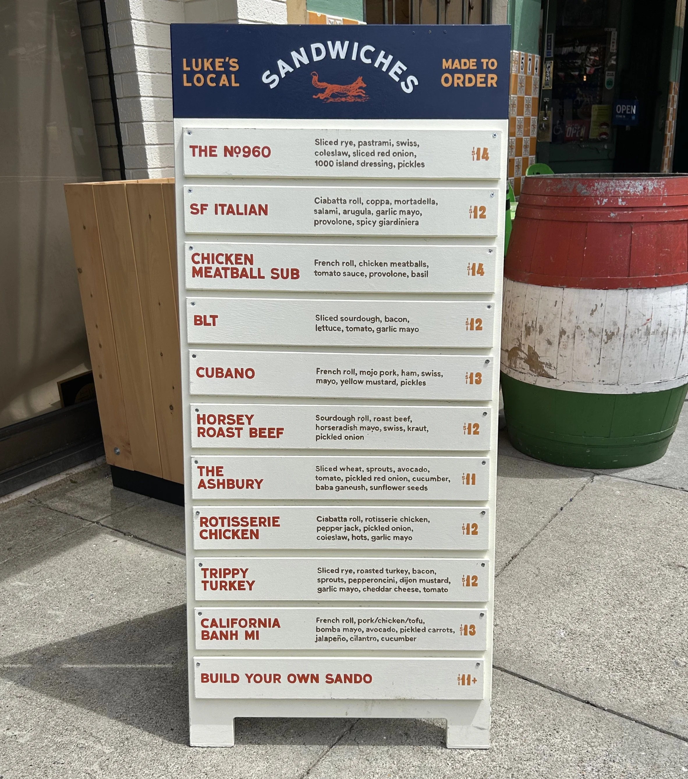 There were two modular boards - a flat, hanging sign for inside and an A-frame sign for the sidewalk outside - that had removable slats listing each sandwich on offer. There was also a large hanging sign for the meat+seafood counter detailing how they source their products.
