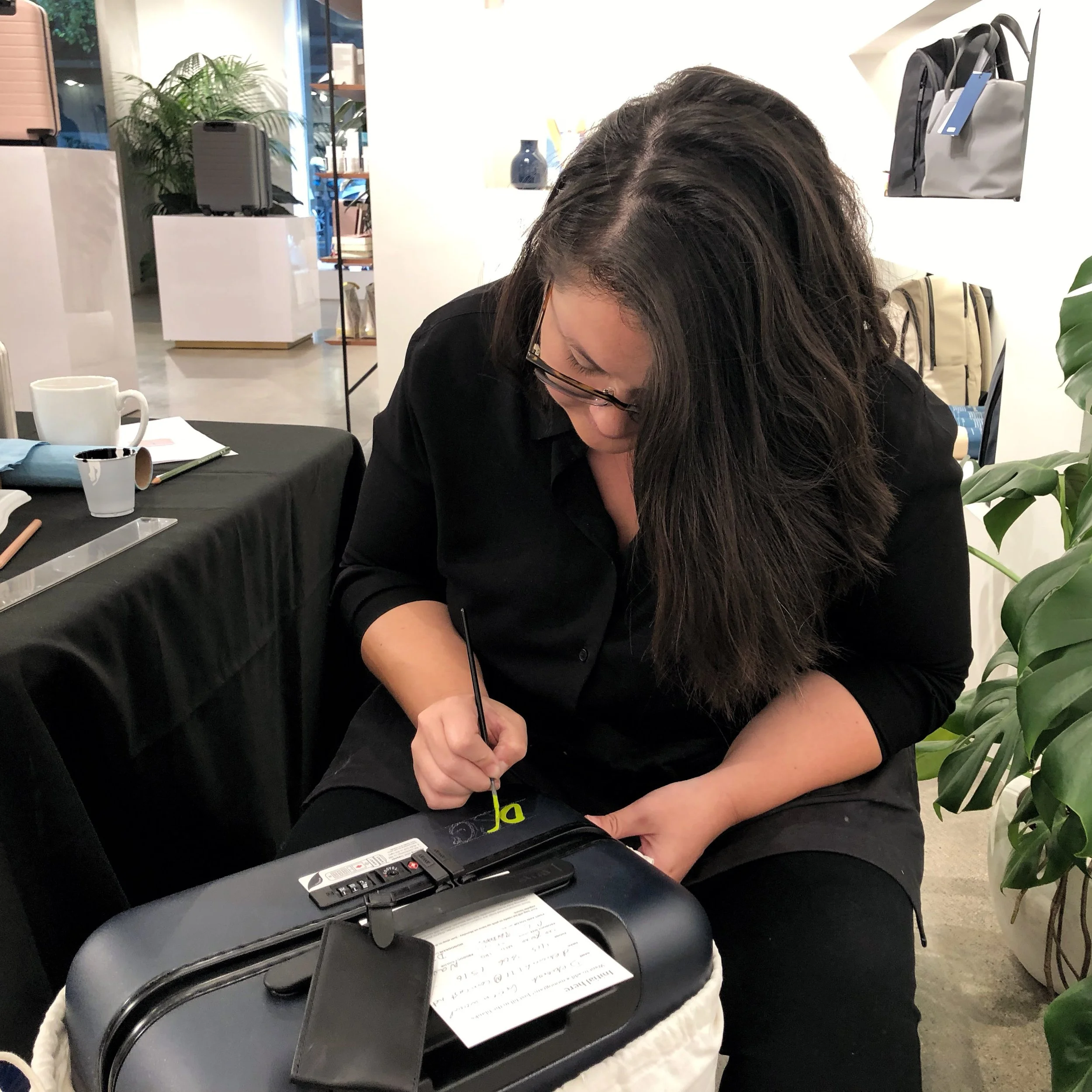 Luggage tag monograms at Madison Reed, Palo Alto